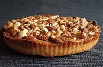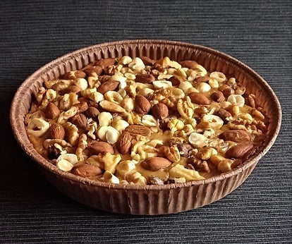 Deze boterkoek heeft een flinke laag karamel en is helemaal bedekt met een notenmix. Werkelijk een smaaksensatie, die je gewoon wilt proeven. Maar denk dan even niet aan de calorieën.