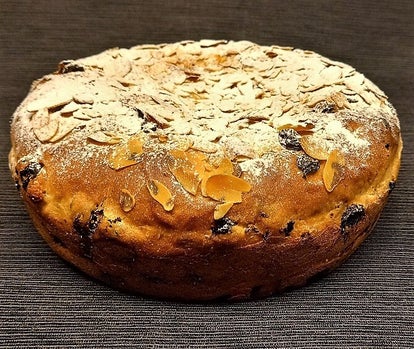 Dit mooie ronde brood is op basis van een deeg waarin rijkelijk rozijnen en krenten zijn verwerkt. Daarnaast heeft het brood een smeuïge vulling welke gemaakt is van 100% amandelspijs vermengd met zelfgekookte banketbakkersroom.