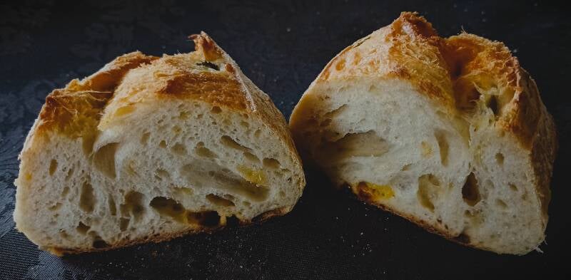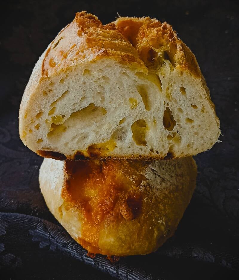 Het jalapeño-cheddarbrood is een licht desembrood gemaakt van Frans tarwebloem en een beetje gebuild tarwemeel. Aan het deeg zijn kleine blokjes cheddar kaas en stukjes jalapeño toegevoegd.