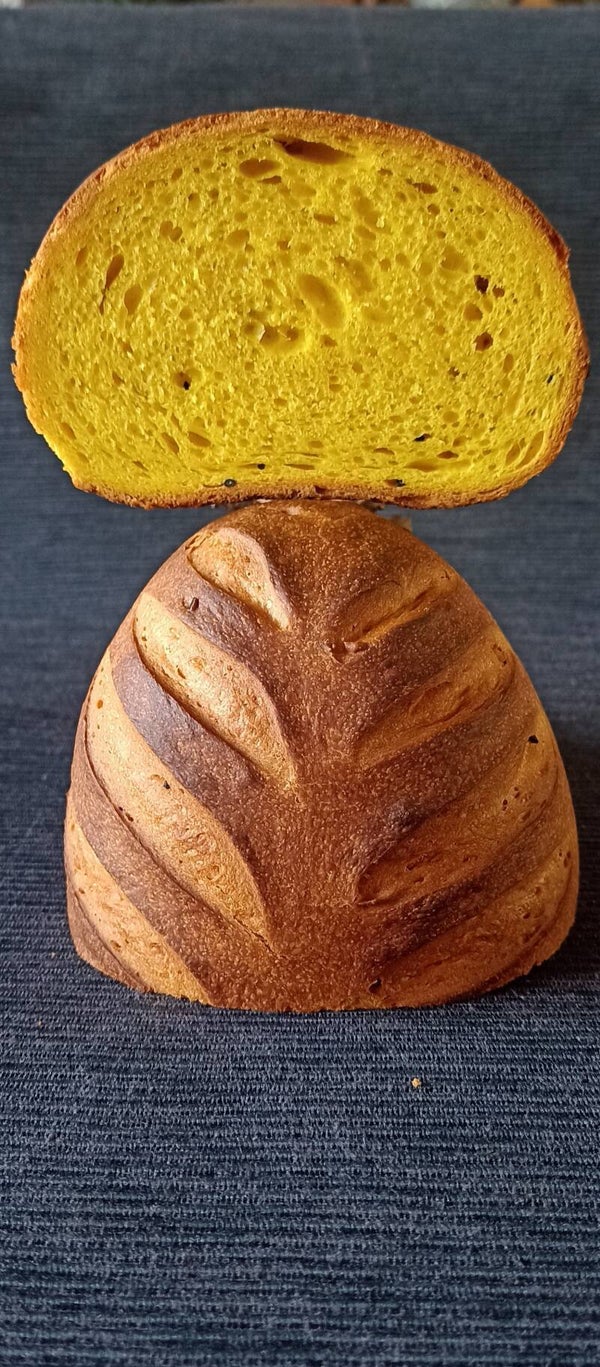 Een zacht brood met een prachtige gele kleur door het gebruik van kurkuma. Daarnaast zijn er nigellazaadjes, ook wel zwarte komijn genoemd, door het deeg verwerkt. Een mooie kleurcombinatie.